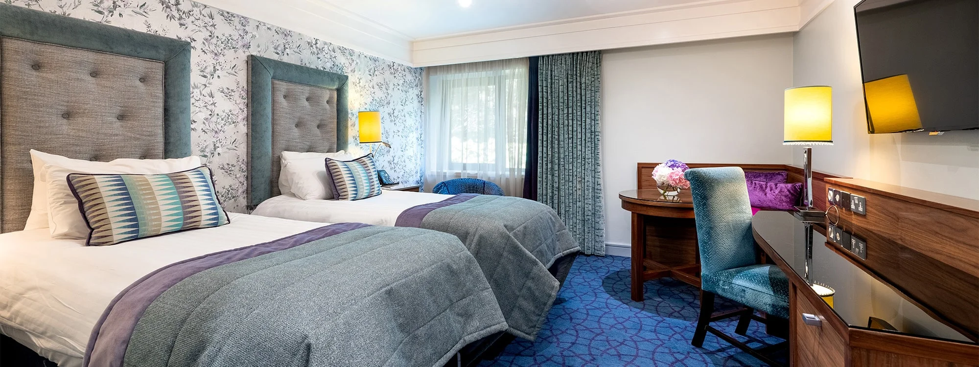 Our stunning Deluxe bedrooms feature a range of boutique schemes, from classic country Heritage to sleek, contemporary styles. Each room is thoughtfully designed with bold fabrics and unique wall coverings, creating a distinct atmosphere.